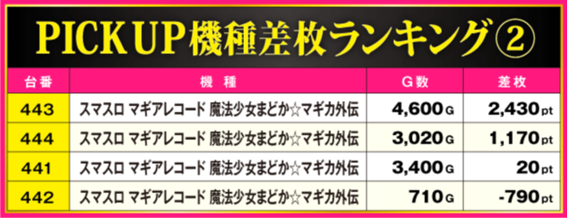 今回のPICK UP機種は全3機種。万枚超を達成した『吉宗』は他の台からも+4,220pt、+3,770ptといった好成績が確認されている。また、『スマスロ マギアレコード 魔法少女まどか☆マギカ外伝』は全4台中3台、『アイムジャグラーEX』は半数以上の台がプラス差枚となっているだけに、それぞれのシマは常に活気に満ち溢れていた。