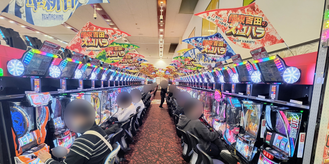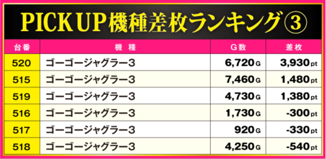 今回のPICK UP機種は全3機種。ランキングを制した『いざ!番長』以外にも、『L 東京喰種』が+5,400pt、『ゴーゴージャグラー3』が+3,930ptを記録している。しかも、3機種トータルの全17台のうち半数ちかくの台がプラス差枚で実戦を終えているだけに、それぞれのシマは常にファンの笑顔と活気に包まれていた。