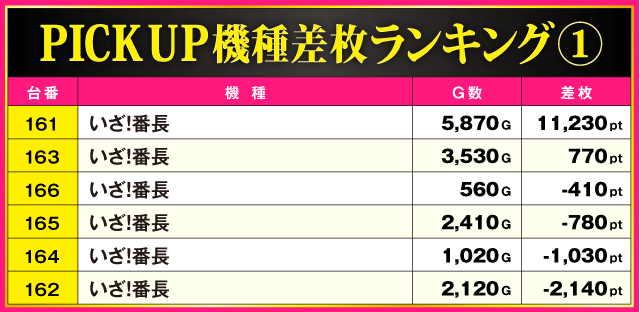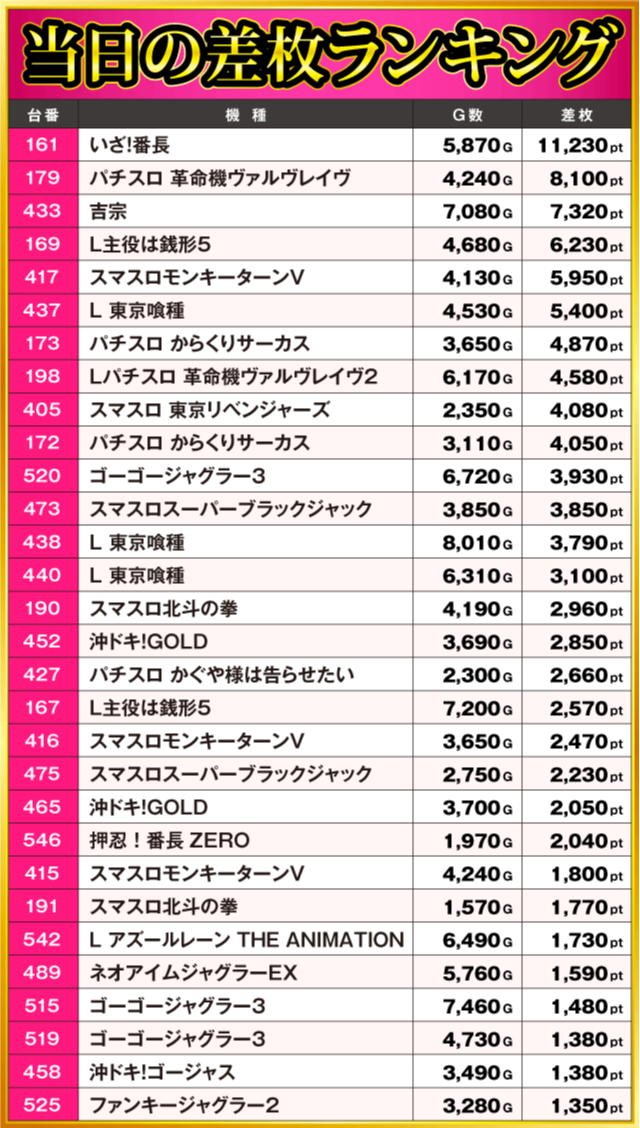 この日は、新旧を問わず様々な機種で好調台を確認。そんな中、『いざ!番長』が+11,230ptを叩き出しランキングトップに輝いている。また、他にも『パチスロ 革命機ヴァルヴレイヴ』から+8,100pt、『吉宗』から+7,320ptが飛び出しており、広範囲に渡ってチャンスが潜んでいたのは間違いないと言えるだろう。