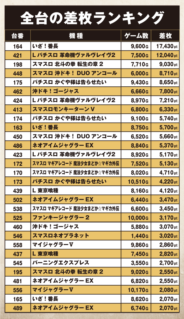 ひときわ輝いていたのは『いざ!番長』。164番台が+17,430ptと圧倒的な成績でトップの座についていた。そして『Lパチスロ 革命機ヴァルヴレイヴ2』421番台が+12,040ptでつづき、1万ptオーバーが2台誕生している。さらに『スマスロ 北斗の拳 転生の章2』198番台の+9,030pt、『スマスロ 沖ドキ!DUOアンコール』448番台の+8,710ptなど、驚異的なptがズラリと並ぶ大迫力のランキングが出来あがっていた。