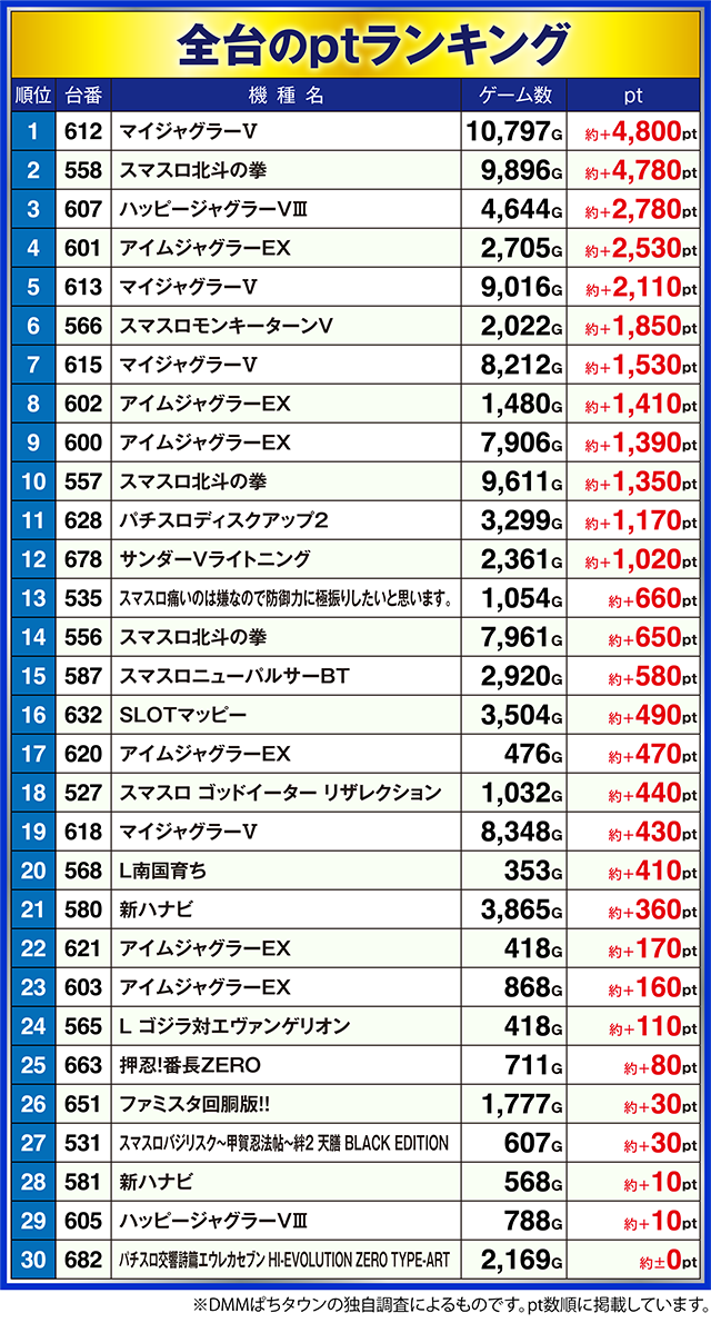 「ハッピージャグラーVⅢ」の607番台や「アイムジャグラーEX」の601番台なども約+2,100pt超。