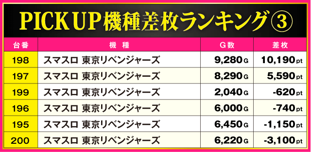 この日、最もプレイヤーの注目を集めたのが『スマスロ 東京リベンジャーズ』で、198番台から万枚超の+10,190pt、197番台から+5,590ptといったハイスコアが飛び出している。また、『L ダーリン・イン・ザ・フランキス』と『マタドールⅢ』が+4,000ptを記録するなど、新台や準新台の活躍が特に目立っていた。