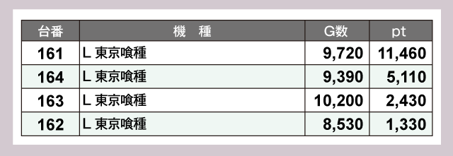 『L 東京喰種』161番台が+11,460ptと、ひときわ輝く成績をおさめた。おなじく164番台も+5,110ptと優秀な結果に。そして『Lパチスロ閃乱カグラ2 SHINOVI MASTER』553番台が+6,410ptで追随。他にも『スマスロ 聖戦士ダンバイン』487番台の+4,890pt、『スマスロモンキーターンV』479番台の+4,850ptなどなど、訪れたプレイヤーたちを満足させるデータが並んでいる。