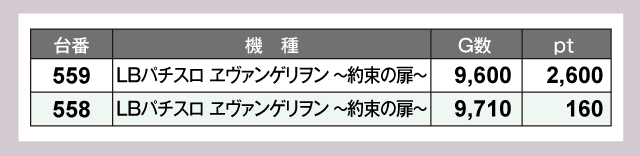 2台設置の『LBパチスロ ヱヴァンゲリヲン ~約束の扉~』も非常に多くのG数が回されていて、どちらもプラスptを叩きだしている。