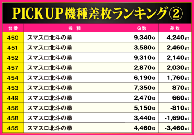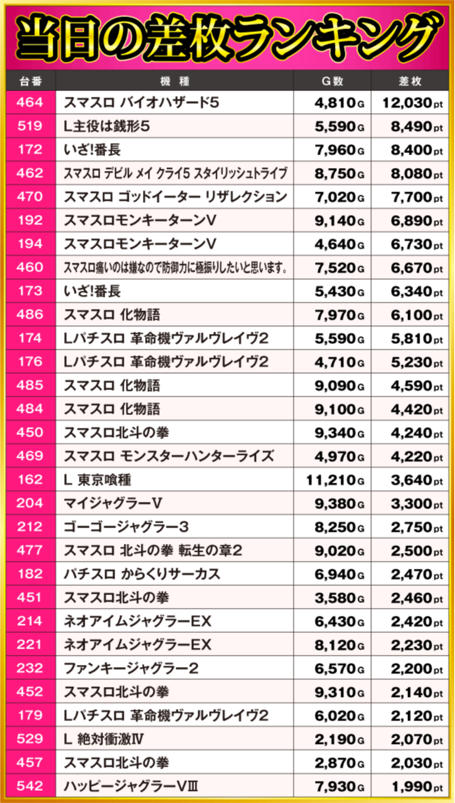 当日の差枚ランキング