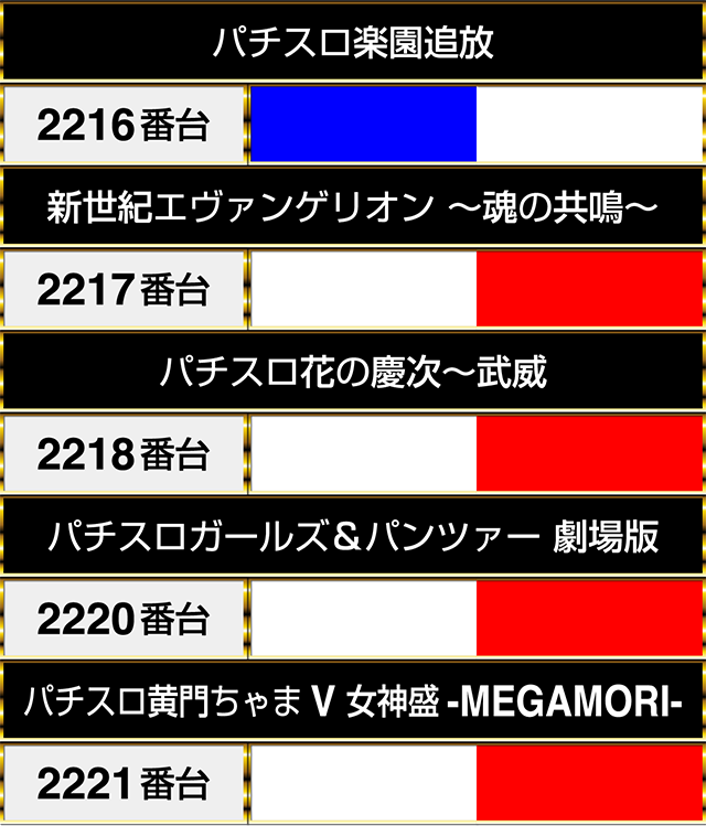 バラエティコーナーでは、2217番台の『新世紀エヴァンゲリオン 〜魂の共鳴〜』から2221番台の『パチスロ黄門ちゃまV 女神盛-MEGAMORI-』までにプラスptが並んだ。
