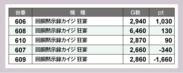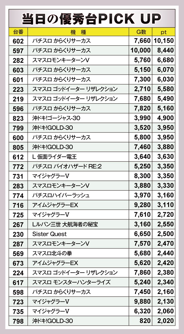 『パチスロ からくりサーカス』は11台中8台がプラス。TOP30に7台がランクインするほか、602番台の+10,150ptを筆頭に4桁pt獲得台が続出していた。
