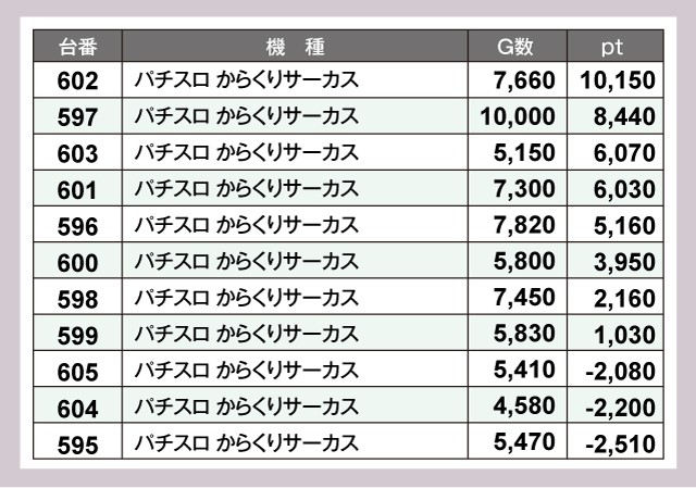 ランキングを見てみると、『パチスロ からくりサーカス』がワンツーフィニッシュを達成。602番台は唯一の1万ptオーバーで+10,150ptという爆発力を見せた。