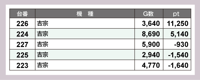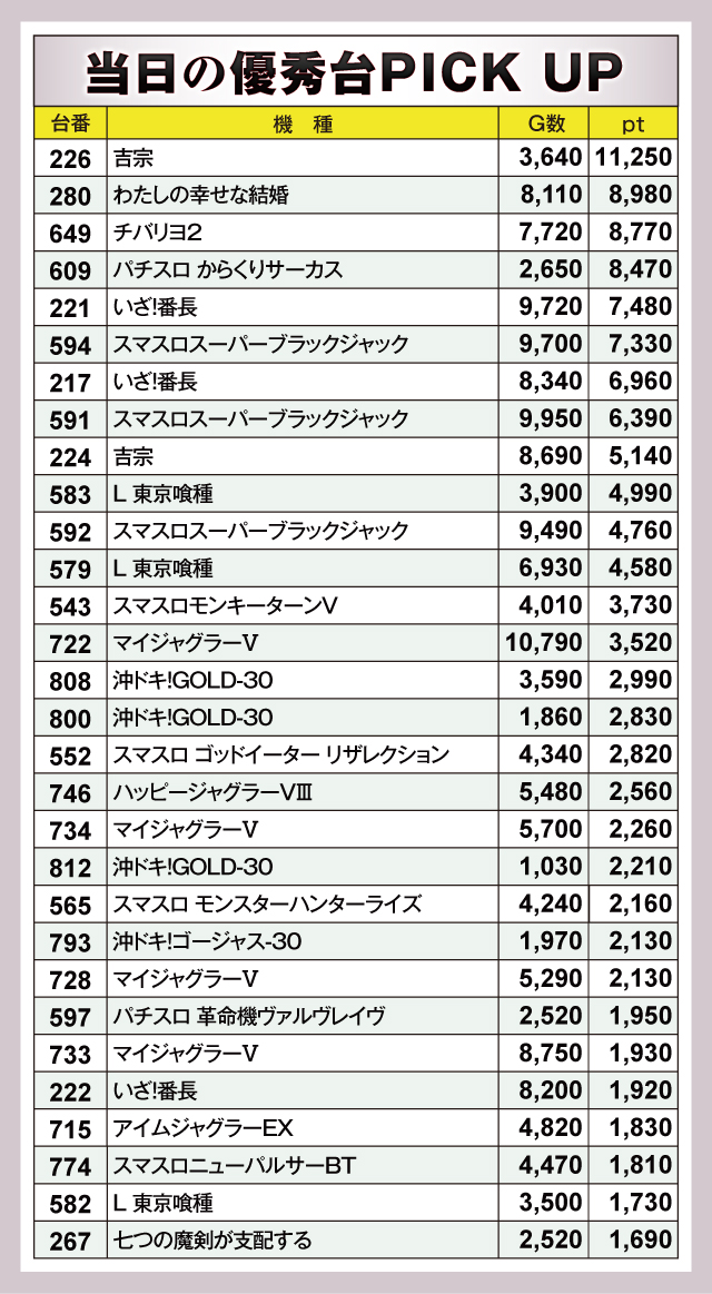 頭ひとつ抜けたのは『吉宗』。226番台が+11,250ptと見事な成績を残している。他にも『わたしの幸せな結婚』280番台が+8,980pt、『チバリヨ2』649番台が+8,770pt、『パチスロ からくりサーカス』609番台が+8,470ptと並ぶ。以下『いざ!番長』221番台の+7,480ptなど、様々な機種がそのポテンシャルを発揮していた。