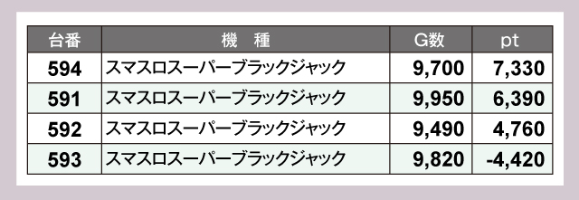『スマスロスーパーブラックジャック』は4台中3台がプラスpt。いずれの台も9,000G以上が回されていて、プレイヤーをトリコにしていたようだ。