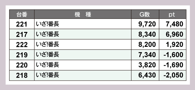 6台設置の『いざ!番長』も非常に高稼働で、221番台と217番台が飛躍的な成果をあげている。
