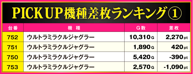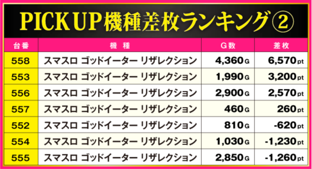 今回のPICK UP機種は全2機種で、『ウルトラミラクルジャグラー』からは+2,270pt、『スマスロ ゴッドイーター リザレクション』からは+6,570ptが発生。さらに、両機種合わせた全11台中6台がプラス差枚で実戦を終えているだけに、ファンにとって充実の一日となったのは間違いないだろう。