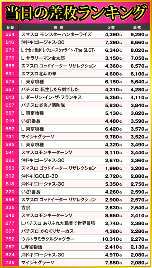 早速、店内状況をチェックすると『スマスロ モンスターハンターライズ』が万枚目前の+9,280ptを叩き出しランキングトップに。次いで『沖ドキ!ゴージャス-30』と『L 少女☆歌劇 レヴュースタァライト -The SLOT-』が+8,000pt超を記録するなど、人気機種を中心に多数のハイスコアが確認されている。