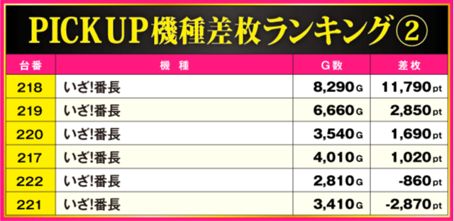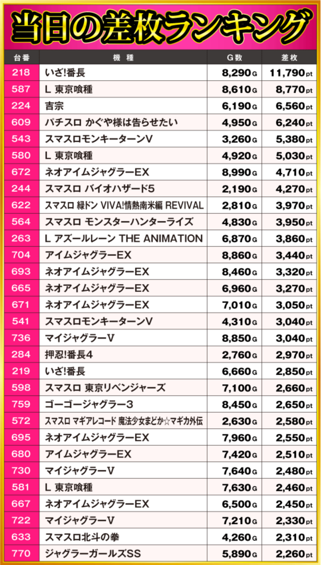 この日、最もプレイヤーの注目を集めたのが『いざ!番長』で、218番台が万枚超の+11,790ptを叩き出しランキングトップに。次いで『L 東京喰種』が+8,770pt、『吉宗』と『パチスロ かぐや様は告らせたい』が+6,000pt超を記録するなど、人気機種を中心に多数の好調台が確認されている。