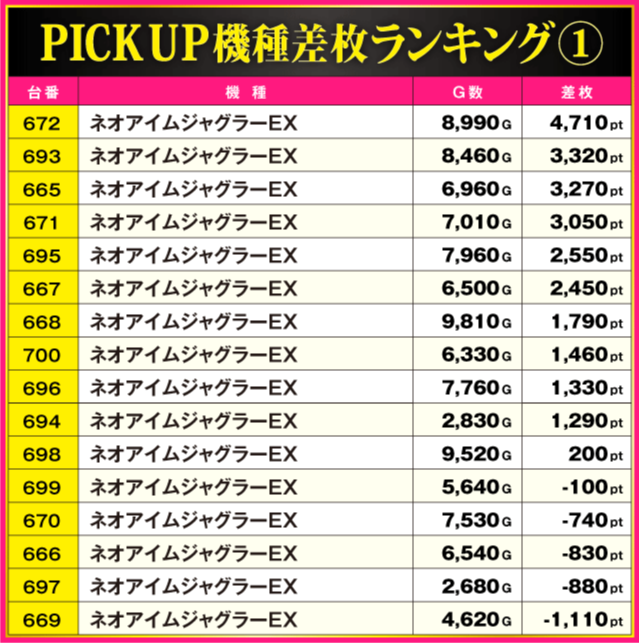 続いてPICK UP機種の状況をチェック!! ランキングを制した『いざ!番長』は、最終的に全6台中4台がプラス差枚で実戦を終える見事な結果に。また、ジャグラーシリーズの最新作『ネオアイムジャグラーEX』も、+4,710ptをはじめ+3,000pt超が3台も発生する盛況ぶりを見せファンを喜ばせていた。