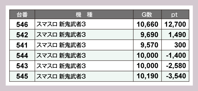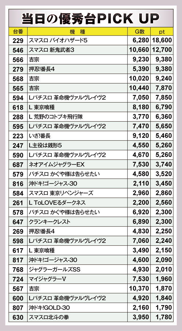 『スマスロ バイオハザード5』229番台が+18,600ptと、他を大きく引き離す成績で輝いていた。そして『スマスロ 新鬼武者3』546番台が+12,700ptで、負けじと素晴らしい結果をのこしている。ここで注目なのは『吉宗』。566番台が+9,380pt、568番台が+9,240pt、565番台が+7,870ptと超優秀台が続出していた。他にも『押忍!番長4』279番台の+9,380ptなどなど、誰もがうらやむptが無数に詰まった、見応え満点のデータが出来あがっている。