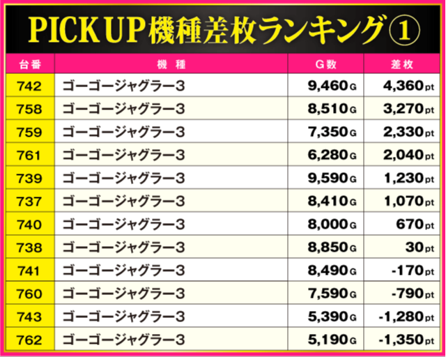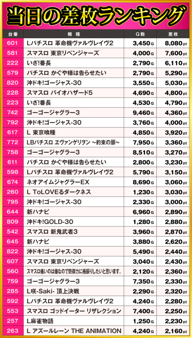 当日の差枚ランキング