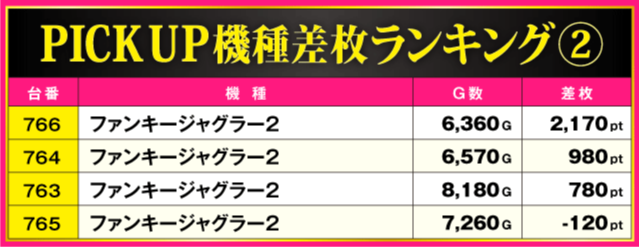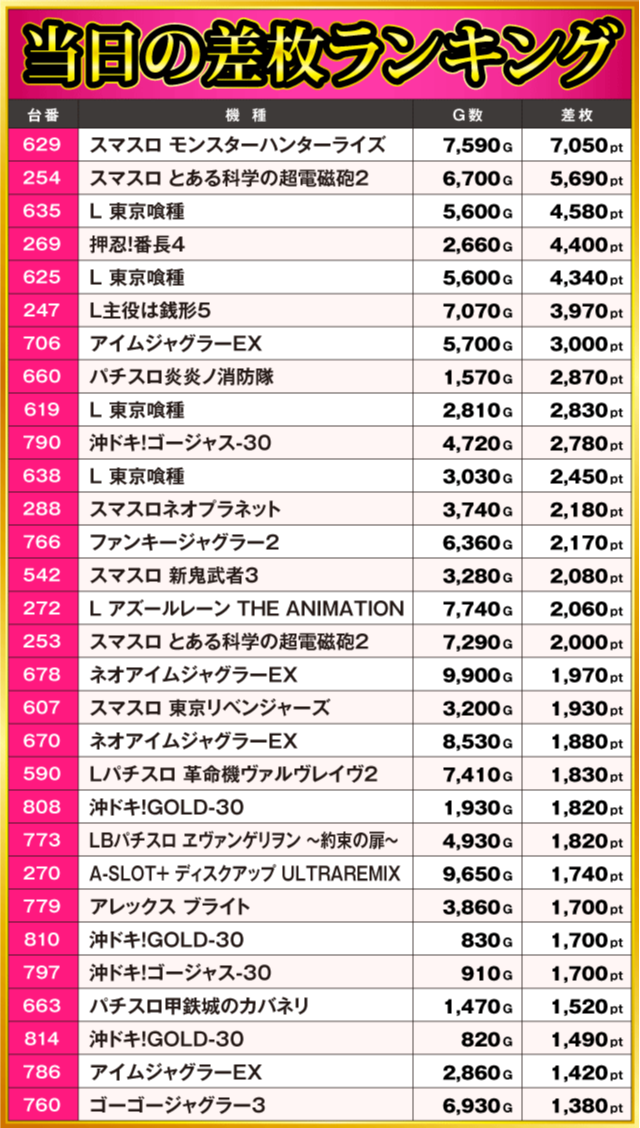 この日は、『スマスロ モンスターハンターライズ』が+7,050ptを叩き出しランキングトップに。次いで、導入間もない新台の『スマスロ とある科学の超電磁砲2』が+5,690ptを記録している。また、『L 東京喰種』の活躍も目立っており、635番台の+4,580ptをはじめ差枚TOP10に3台がランクインする勢いを披露しファンを喜ばせていた。