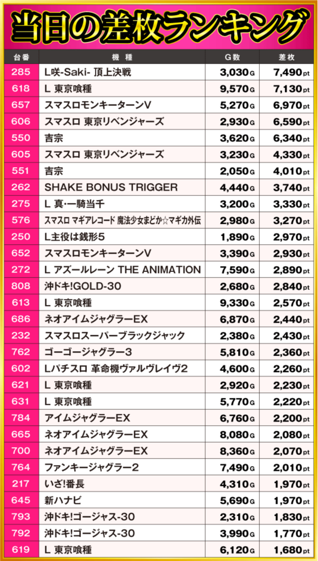 この日は、『L咲-Saki- 頂上決戦』と『L 東京喰種』が+7,000pt超を叩き出しプレイヤーの注目を集めていた。また、他にも『スマスロモンキーターンV』と『スマスロ 東京リベンジャーズ』、『吉宗』が+6,000pt超を記録するなど、人気のスマスロを中心にハイスコアが続出し店内を盛り上げていた。