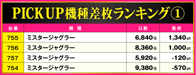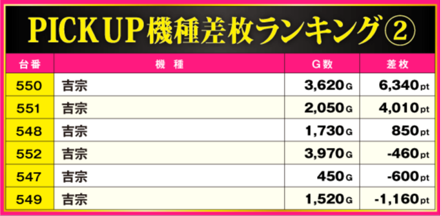 次にPICK UP機種の状況を見ていくと、差枚上位にランクインした『吉宗』は+6,000pt超以外にも+4,010ptが発生。また、『ミスタージャグラー』は全4台中2台がプラス差枚となる圧倒的な安定感を披露しているだけに、ファンにとっては存分に楽しめた一日となったはずだ。