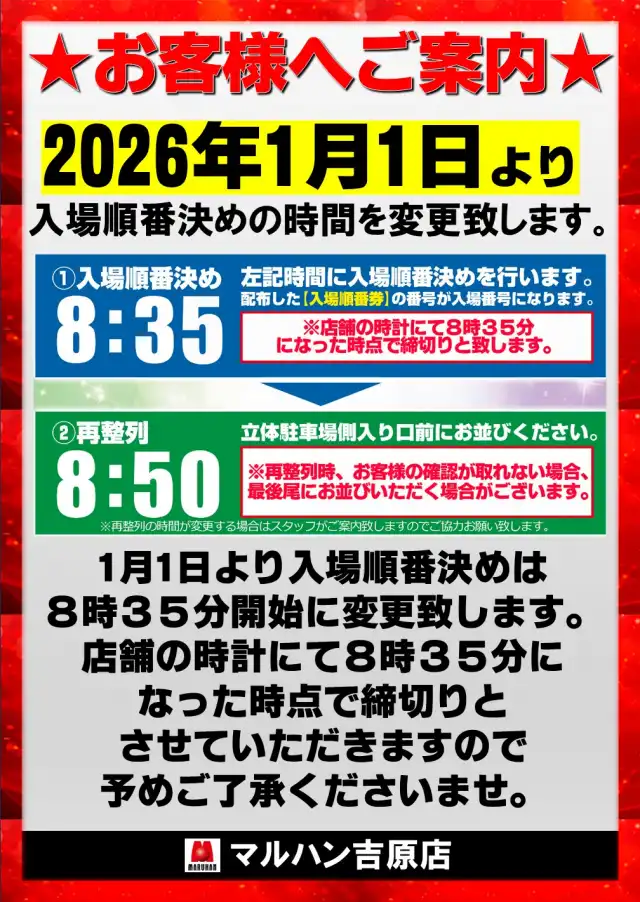 毎日指定時間までに整列されたお客様対象に入場順番決めを行っております。 |