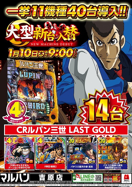 1/10(木)大型新台入替!ルパン14台・蒼天8台導入済!