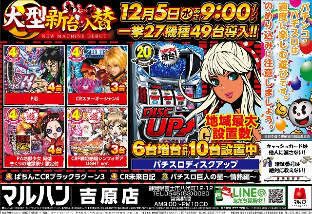 12/5(水)大型新台入替!ディスクアップ地域最大数設置!
