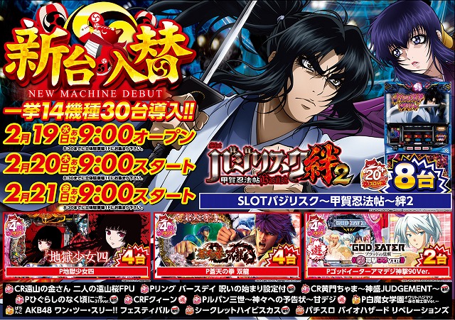 明日2/19(水)新台入替初日!朝9時オープン!