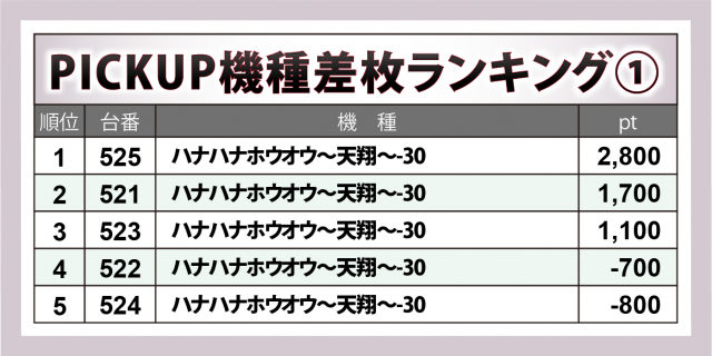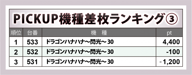 計13台の内8台が勝利を収め、4桁プラスは5台。+4千を超えた『ドラゴンハナハナ~閃光~ 30』を筆頭に、+3千近くとなった『ハナハナホウオウ~天翔~-30』が目立った。
