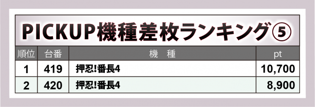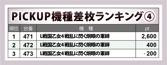 『押忍!番長4』419番台が万枚突破に成功した他、隣の420番台も+9千に迫るビッグヒット。『L戦国乙女4 戦乱に閃く炯眼の軍師』では+3千が見える台が生じていた。