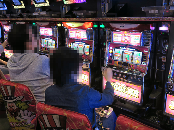 20円パチスロではジャグラーシリーズが盛況。特に取材時には女性の姿も多く確認でき、シンプルな告知を楽しむ姿があった。