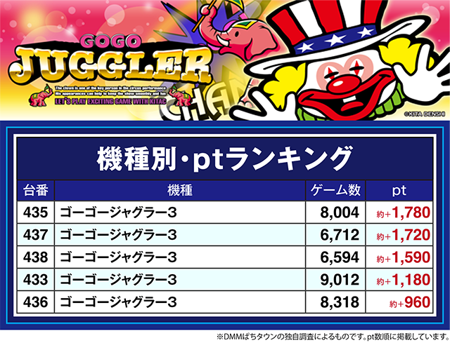 「ゴーゴージャグラー3」も4台が約+1,100pt以上となった。