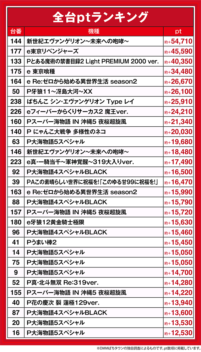 ほかにも、「いざ!番長」や「L 東京喰種」など、多彩な機種に約+5,000ptを超えた台があった。