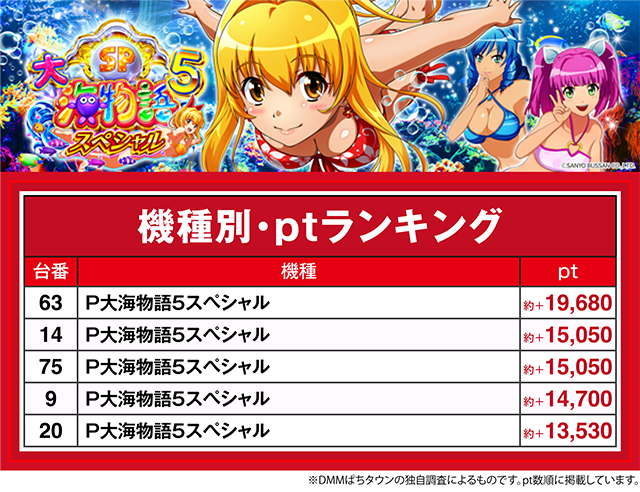 「P大海物語5スペシャル」の63番台が約+20,000ptクラス。