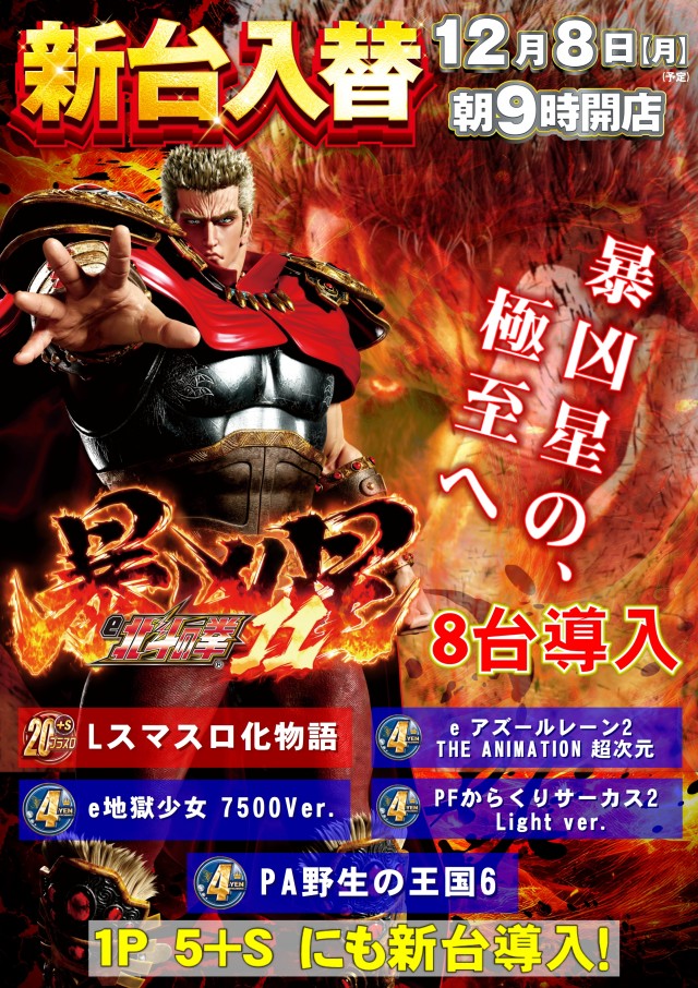 【周年月間】12/8新台入替!! e北斗の拳暴凶星導入!!