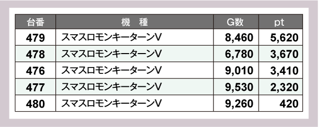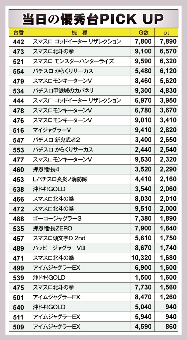 スマスロを中心にハイパフォーマンスを見せており、442番台『スマスロ ゴッドイーター リザレクション』+7,890pt、473番台『スマスロ北斗の拳』+6,570pt、521番台『スマスロ モンスターハンターライズ』+6,320ptなど、あらゆる機種が+5,000ptオーバーを達成していた!