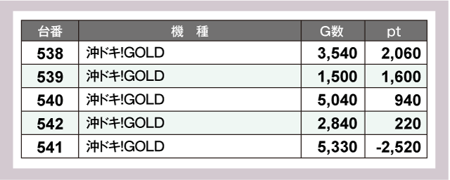 さらに『沖ドキ!GOLD』も5分の4がプラスで、538番台は+2,060ptと素晴らしい記録を残している。