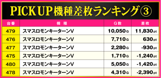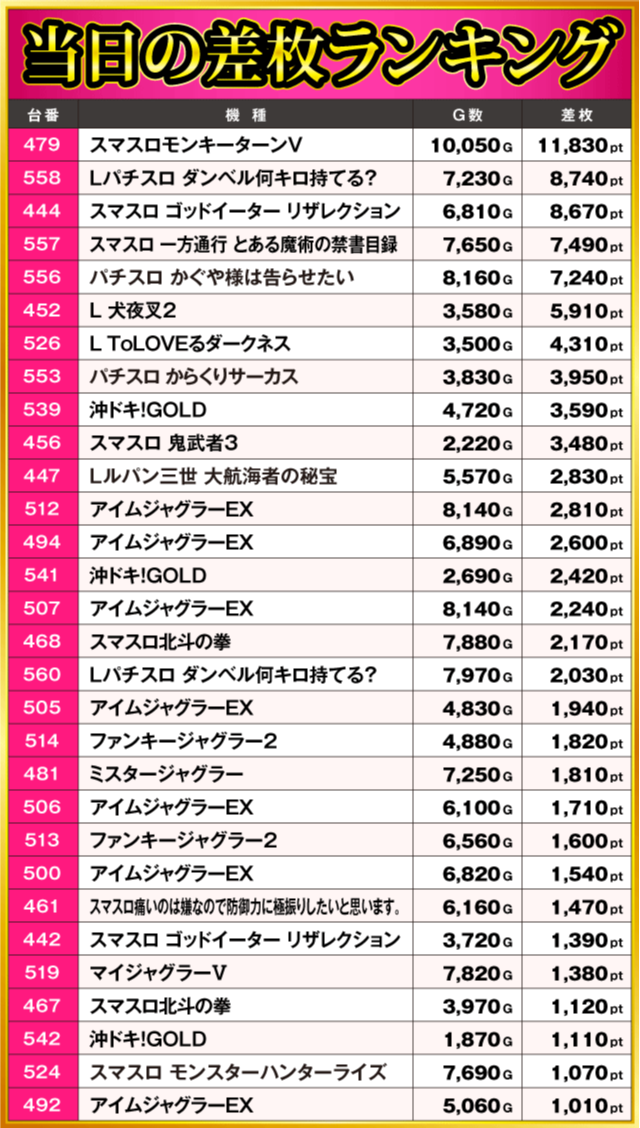 この日、最もプレイヤーの注目を集めたのが『スマスロモンキーターンV』で、479番台が+11,830ptを叩き出しランキングトップに輝いた。次いで『Lパチスロ ダンベル何キロ持てる?』と『スマスロ ゴッドイーター リザレクション』が+8,000pt超と、トップ3が実に優秀な成績を残す盛況ぶりを見せていた。