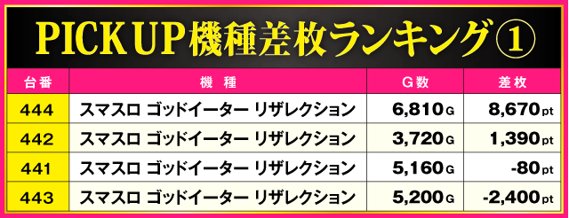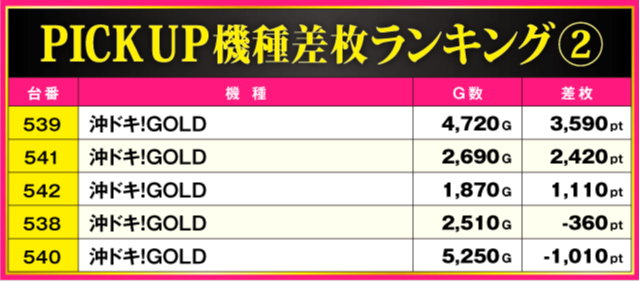 次にPICK UP機種の様子をチェックしてみると、3機種トータルで全15台あるうち、約半数の台がプラス差枚で終了。なかでも『沖ドキ!GOLD』は、539番台の+3,590ptをはじめ全5台中3台がプラスとなっているだけに、ファンにとっては充実した一日になったと言えるだろう。