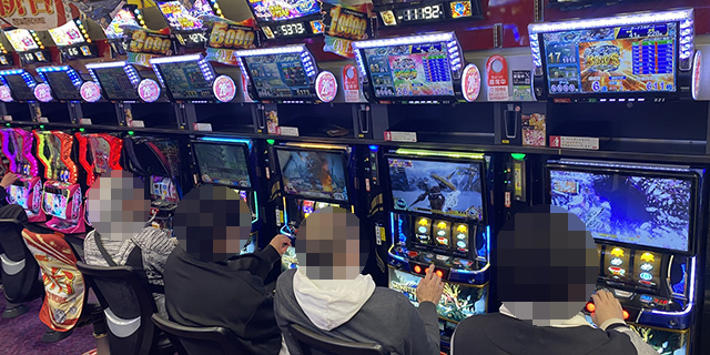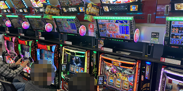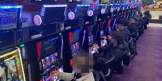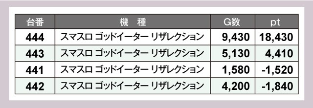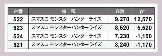 この日はスマスロを中心に大盛況。444番台『スマスロ ゴッドイーター リザレクション』の+18,430ptをはじめ、522番台『スマスロ モンスターハンターライズ』+12,570ptなど、複数の機種が1万pt超の好記録をマークしていた。さらに全台系をはじめ、あらゆる機種に好調台が誕生していたことも印象に残っている。