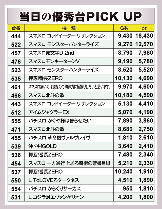 『スマスロ ゴッドイーター リザレクション』と『スマスロ モンスターハンターライズ』はともに1万ptオーバーの好調台が飛び出す大活躍。プレイヤーたちの満足度もかなり高そうだ。