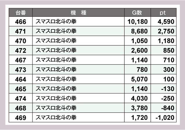 さらに『スマスロ北斗の拳』は半数以上がプラスで、特に466番台が+4,000ptオーバーと素晴らしい記録を残している。