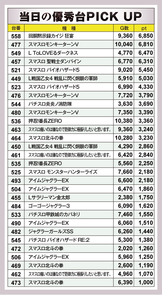 この日は『回胴黙示録カイジ 狂宴』や『スマスロモンキーターンV』、『L ToLOVEるダークネス』など多数の機種が+6,000ptオーバーを達成。さらに『スマスロ バイオハザード5』や『L戦国乙女4 戦乱に閃く炯眼の軍師』も+5,000ptオーバーと圧巻のパフォーマンスを披露している。