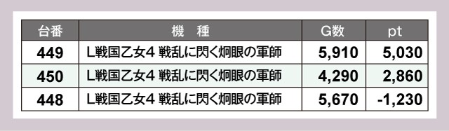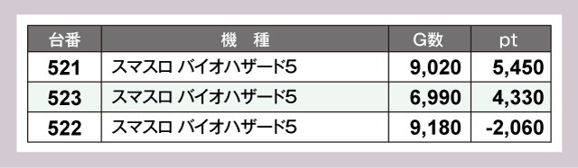 『スマスロ バイオハザード5』と『L戦国乙女4 戦乱に閃く炯眼の軍師』は3台中2台がプラスで終了。どちらも+5,000pt超えの素晴らしい記録を残している。