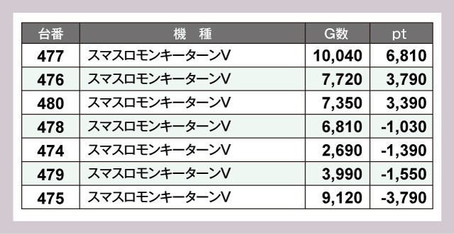 『スマスロモンキーターンV』は477番台の+6,810ptを筆頭に4桁ptの優秀台が複数誕生しており、シマ全体から大いに活気が感じられた。