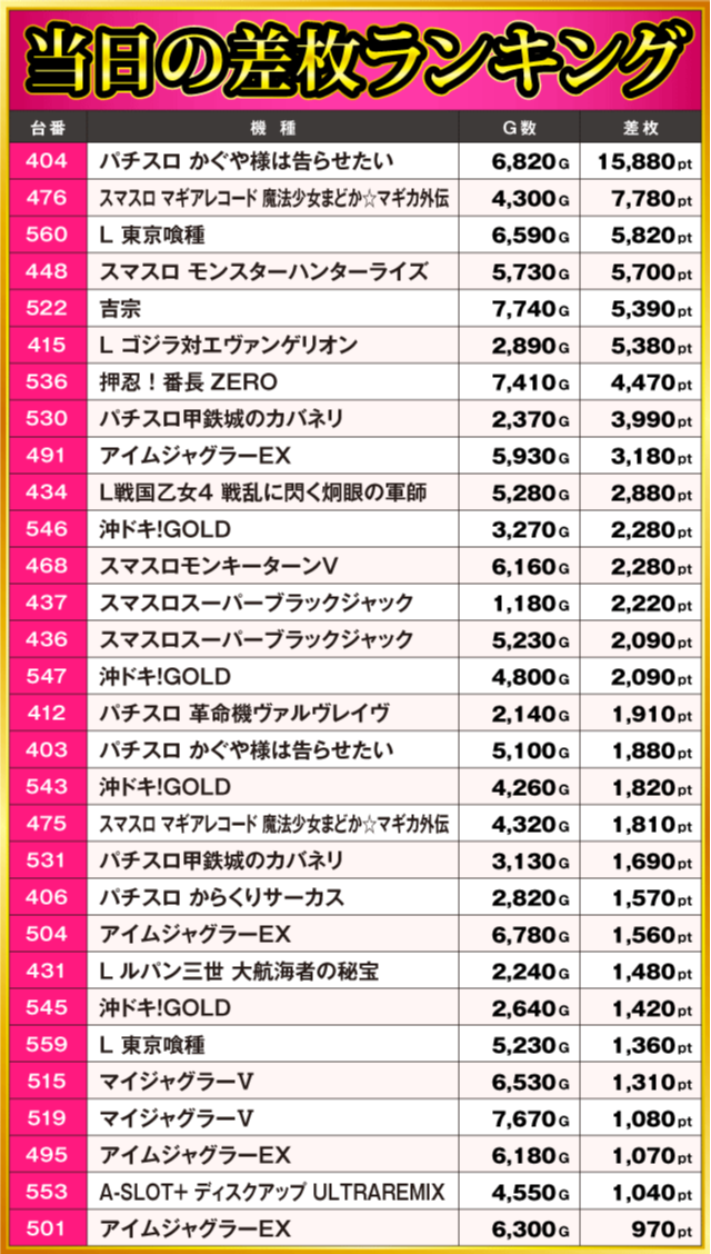 この日、最もプレイヤーの注目を集めていたのが『パチスロ かぐや様は告らせたい』で、怒涛の+15,880ptを叩き出しランキングトップに。次いで『スマスロ マギアレコード 魔法少女まどか☆マギカ外伝』から+7,780pt、『L 東京喰種』から+5,820ptといったハイスコアが飛び出し店内を盛り上げていた。
