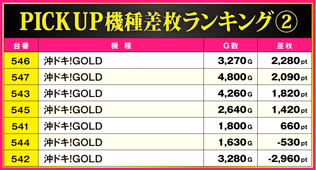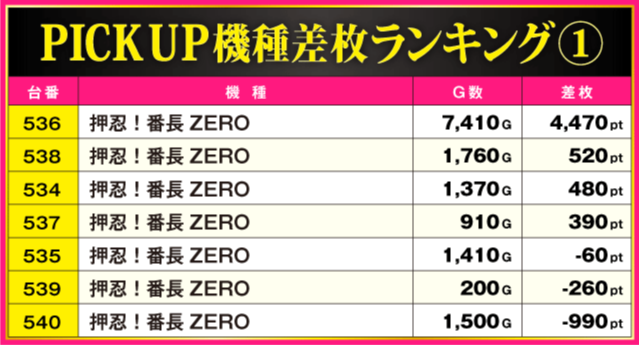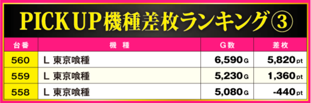 続いてPICK UP機種の状況を見ていこう。『押忍!番長ZERO』は+4,470pt、『L 東京喰種』は+5,820ptが飛び出す盛況ぶりを見せている。また、『沖ドキ!GOLD』は全7台中5台がプラス差枚となる見事な結果を残しているだけに、ファンにとって充実の一日となったのは間違いないだろう。