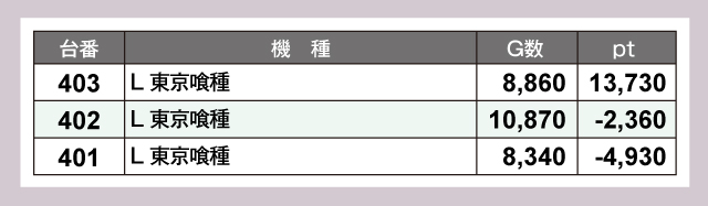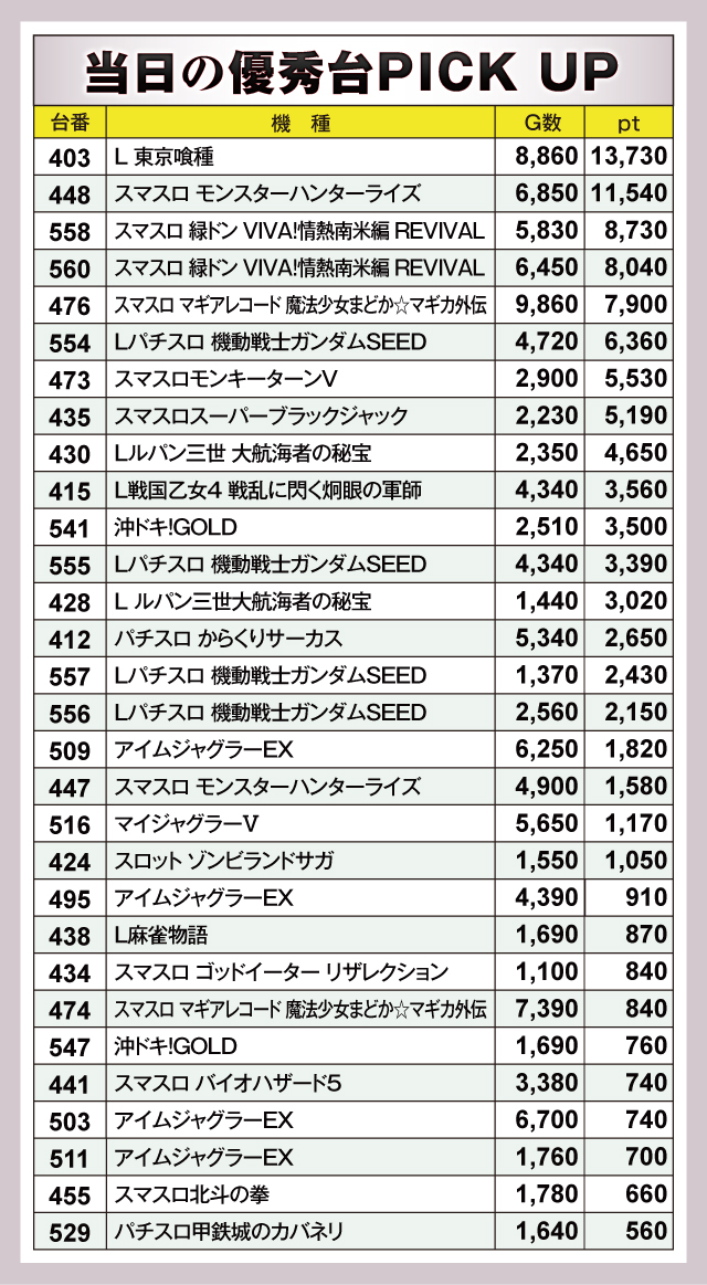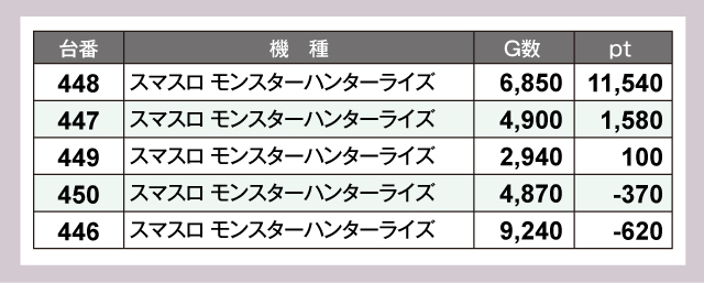 気になる台をピックアップして見てみると、各機種ごとに成果をあげている様子がうかがえる。『L 東京喰種』と『スマスロ モンスターハンターライズ』は1万ptオーバーの台が現れ、トータルptでも大きくプラスで終わっていた。