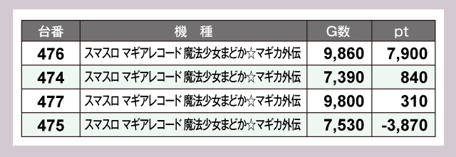 『スマスロ マギアレコード 魔法少女まどか☆マギカ外伝』は4台中3台がプラス。476番台がとくに大きな成績を残している。