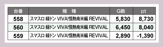 この日はスロットコーナーが大盛況。『L 東京喰種』403番台が+13,730pt、『スマスロ モンスターハンターライズ』448番台が+11,540ptと、見事な大成果をあげている。そして『スマスロ 緑ドン VIVA!情熱南米編 REVIVAL』558番台の+8,730ptや560番台の+8,040ptなどなど、超が付く優秀台が複数並ぶ豪華なデータが仕上がっていた。